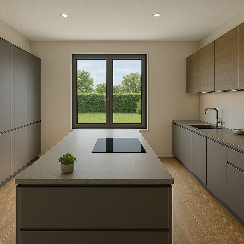 Offenes Wohnkonzept mit Kochinsel, großzügigem Garten (600 m²) und Terrasse.