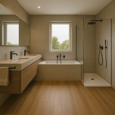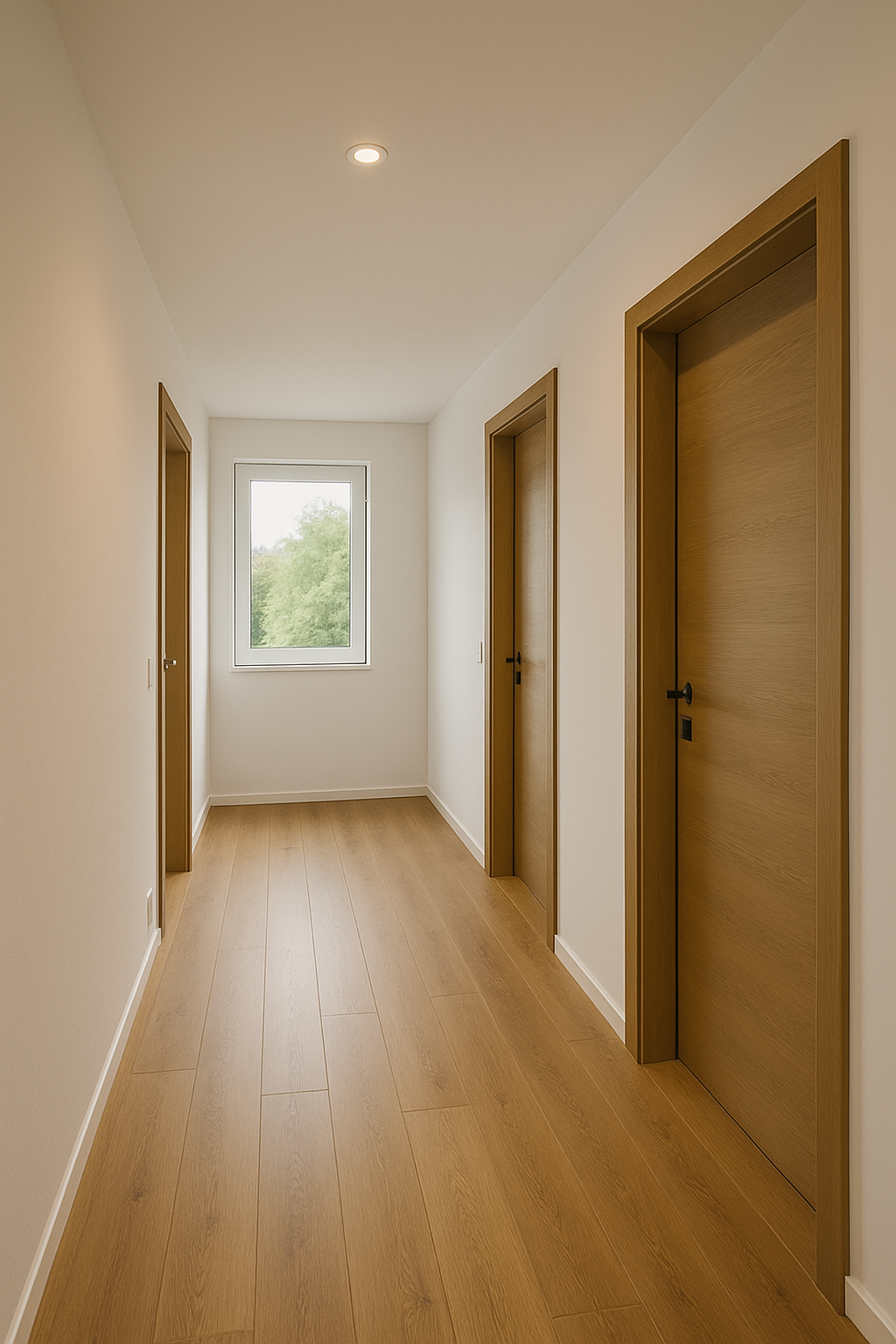 Drei Schlafzimmer, luxuriöses Bad, Fußbodenheizung, Wärmepumpe, Carport.